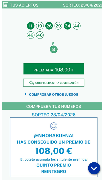 | Múltiple 8 11-19-26-29-34-44-46-48 | Reintegro 8 |
